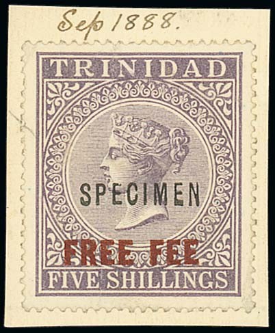 1/- red and green and 5/- lilac, both overprinted "specimen" (D12) and affixed to De La Rue record piece with each dated "Sep 1888". Unique. Photo