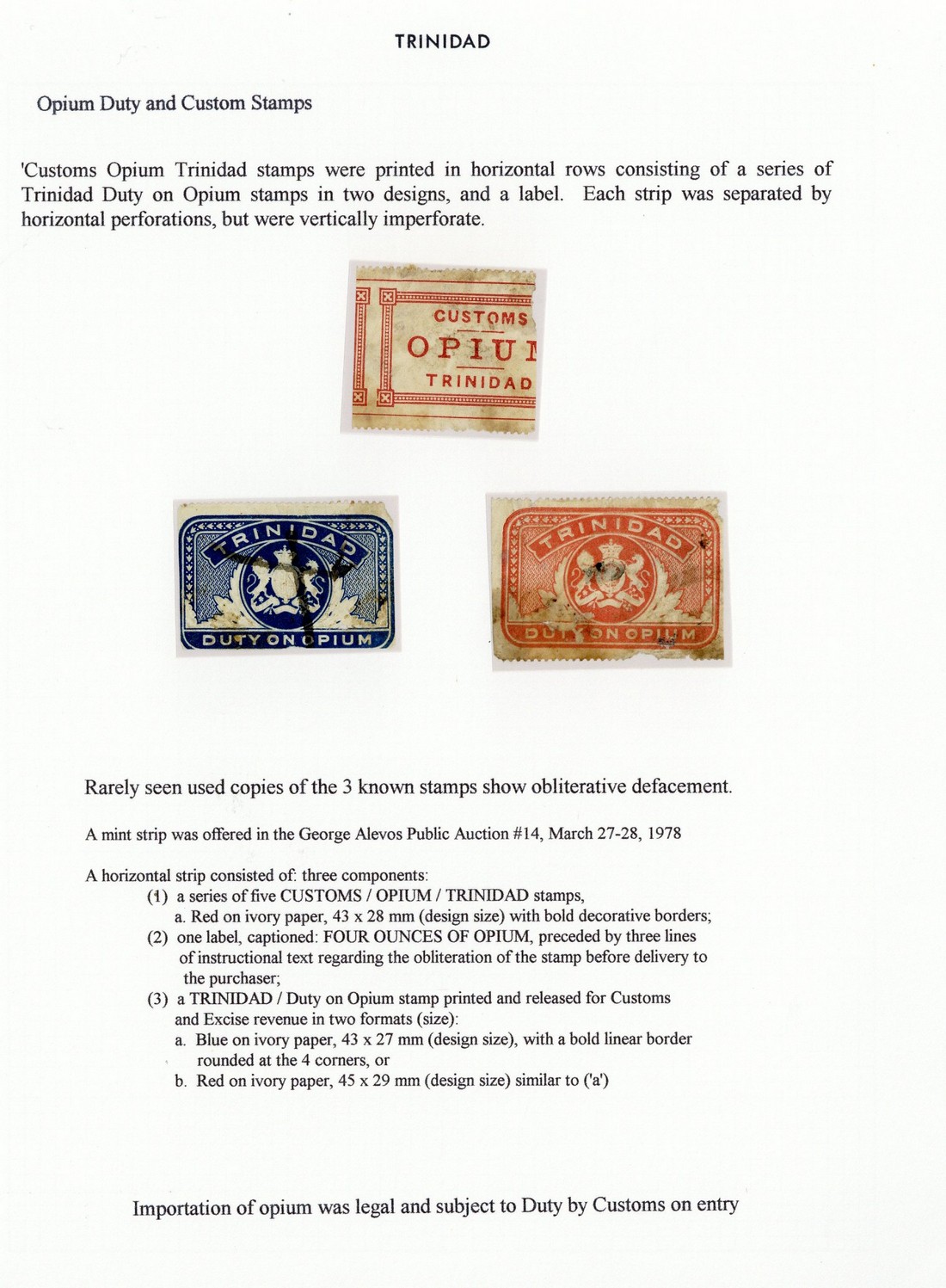 A selection comprising red on white label inscribed "customs/opium/trinidad" and embossed label inscribed "trinidad/duty on opium" in blue and in red; all apparently used with the blue label with a pen cross; defects though a scarce trio