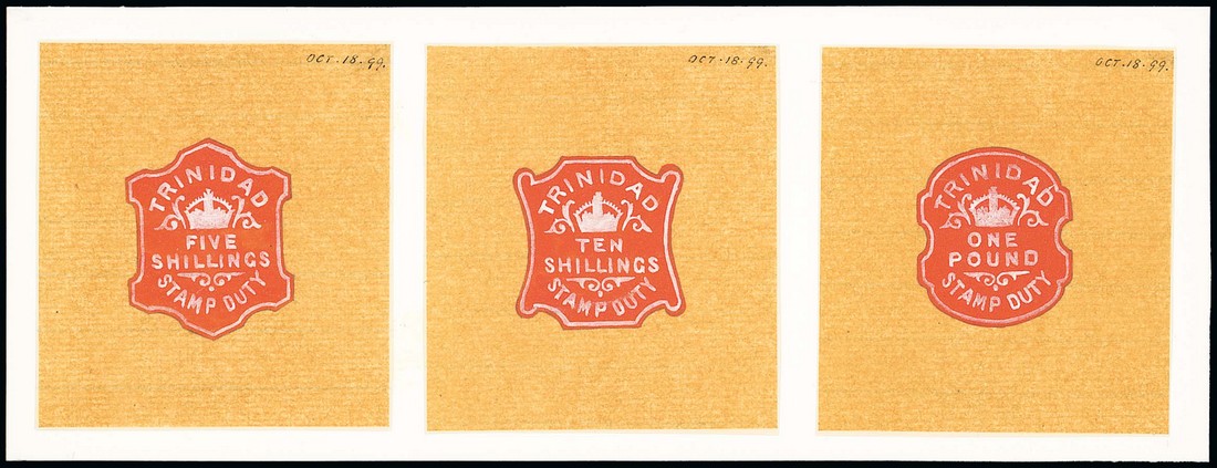1899 1d., 3d., 6d., 1/-, 5/-, 10/-, £1 and £5 hand painted essays in vermilion and Chinese white, each executed on tracing paper (57x62mm., the £5 73x90mm.), the 1d. to £1 each dated "oct. 18. 99.", the £5 "march 15th. 1900"; this series apparently unaccepted with another prepared. A unique group. Photo