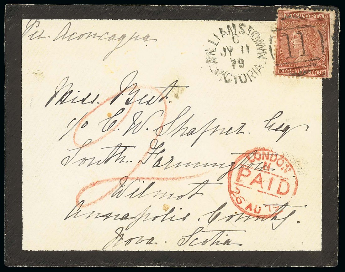 1879 (11 July) mourning envelope, endorsed Per Ancona addressed to Nova Scotia franked 1877 8d. red-brown on pink, tied by "11" duplex of Williamstown, red London Paid (26.8) on front and Wilmot arrival (9.9) on reverse; some tape staining on the reverse, fine. Photo