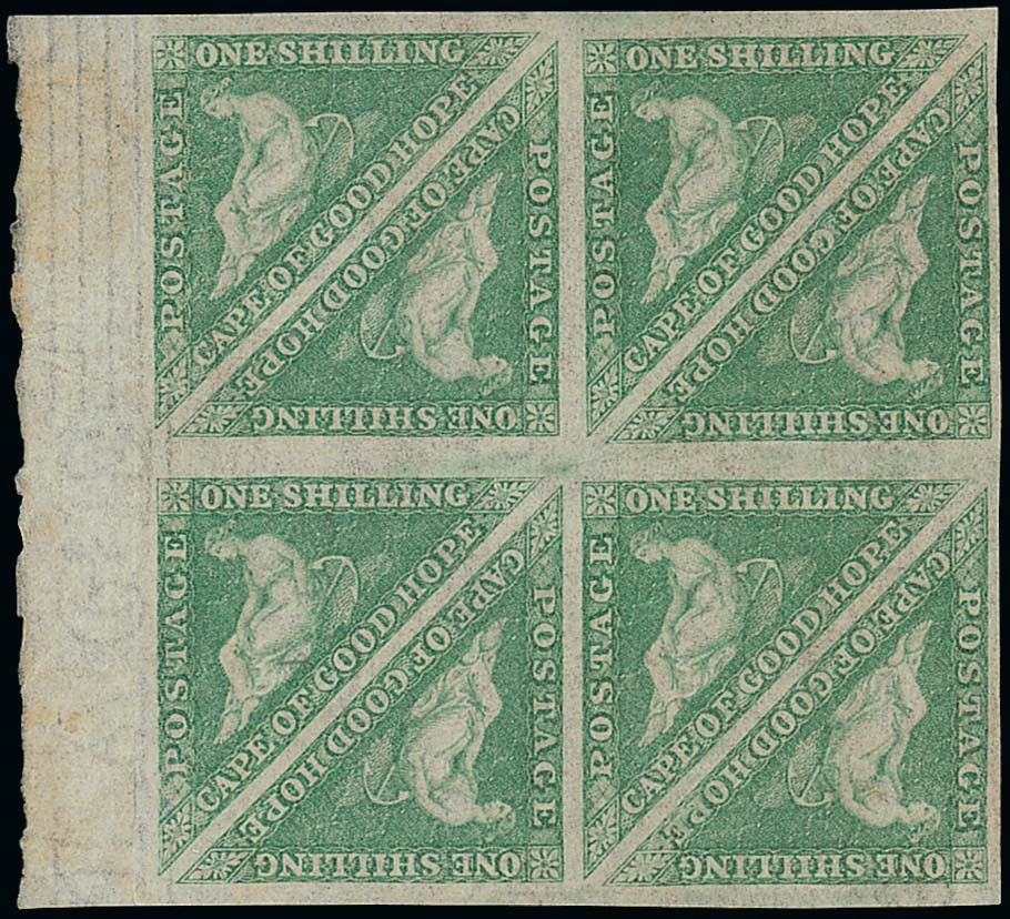 1/- bright emerald-green block of eight, deckle-edged margin at left, good to large margins elsewhere, large part original gum; very fine and an impressive multiple. Brandon Certificate (2008). S.G. 21, £4,400. Photo