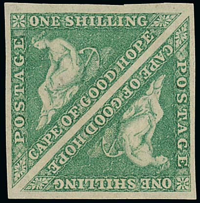 1/- bright emerald-green pair, large margins all round and with large part original gum, strong colour for this stamp; very fine. Holcombe Certificate (1992). S.G. 21, £1,100. Photo