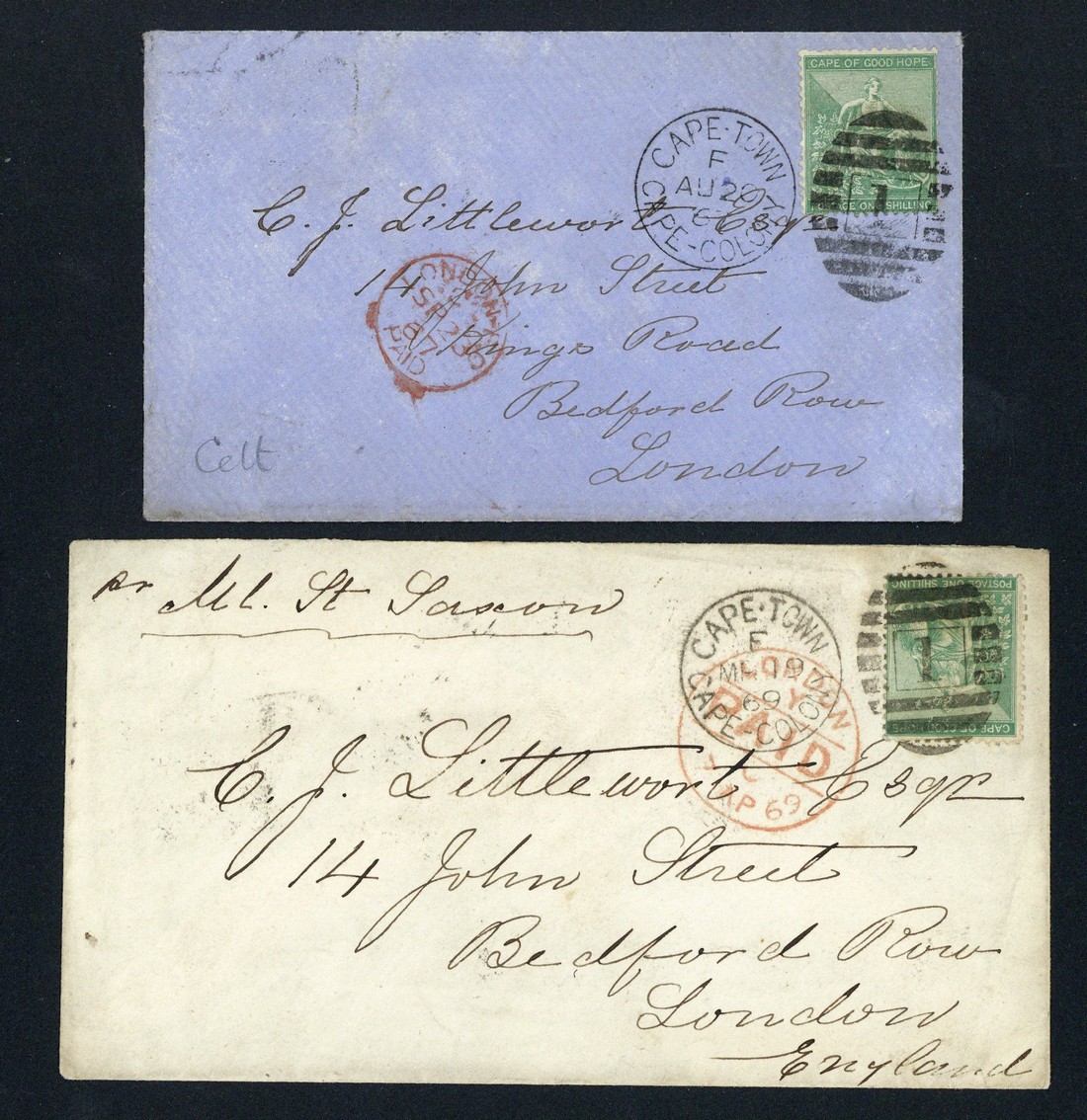 1867 and 1869 envelopes ex the "Littlewort" correspondence from Cape Town to London, the first carried on R.M.S. "Celt" (from notes in The Times), the second endorsed "pr. R.M. St Saxon", both bearing 1/- green cancelled by "1" duplex and showing London Paid arrival c.d.s.; an attractive pair