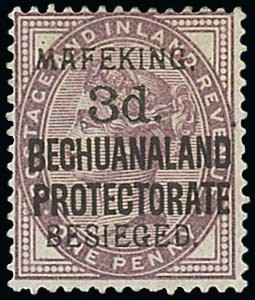 1900 (Apr.) seriffed overprint on Bechuanaland Protectorate, 3d. on 1d. lilac, lightly mounted mint. An attractive example of this scarce stamp. A.P.S. (1979) and B.P.A. (1989) Certificates. S.G. 7, £1,000. Photo