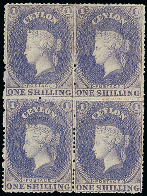 1/- slate-violet block of four, large part original gum, two small hinge remainders, otherwise fresh and fine. A scarce block. S.G. 35. Photo