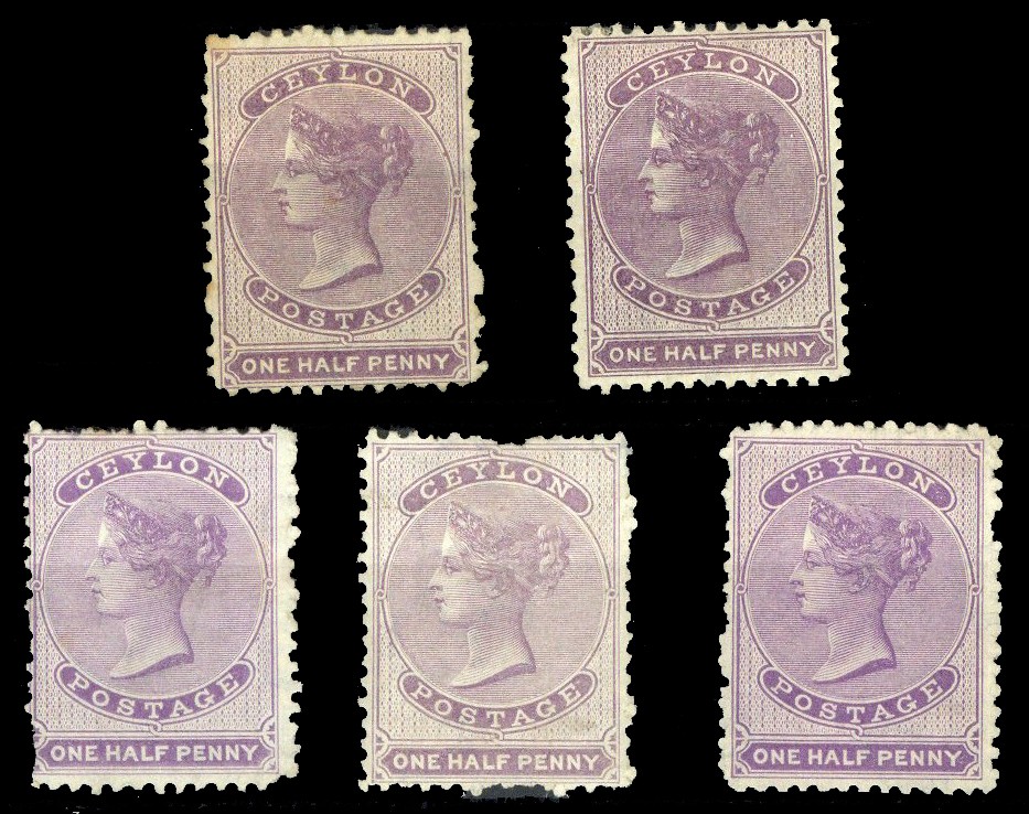 ½d., five examples in slightly differing shades, all unused with small part or part original gum, one with "o" of papermaker's watermark, the usual perforation irregularities, generally fine. S.G. 48