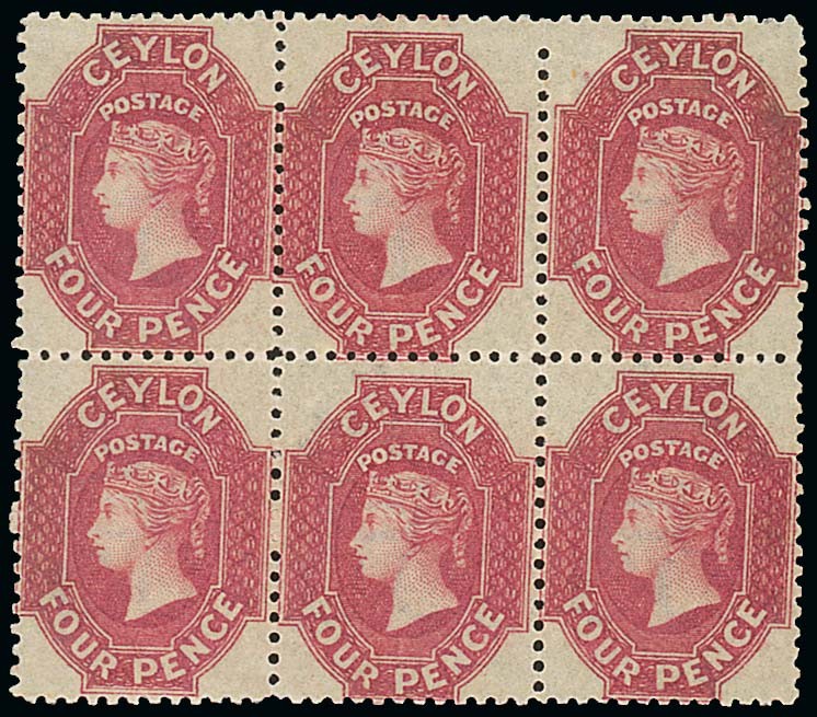 4d. rose-carmine block of six (3x2), large part original gum, fresh and fine. S.G. 65b. Photo