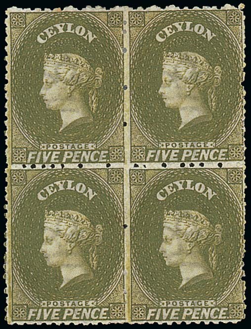 5d. olive-green block of four, large part original gum, one fox spot on reverse, one foxed perforation at top, otherwise fresh and fine. S.G. 66b. Photo