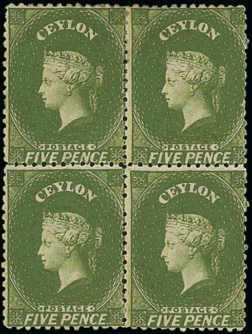 5d. bronze-green block of four, large part original gum; a couple of tone spots, otherwise fresh and fine. S.G. 66c. Photo