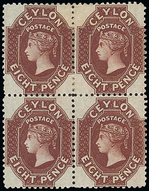8d. chocolate block of four, large part original gum; diagonal gum crease affecting two stamps, otherwise fresh and fine. R.P.S. Certificate (2007). S.G. 68. Photo