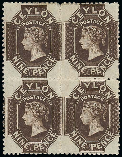 9d. blackish brown block of four, large part original gum, fresh and fine. S.G. 69b. Photo