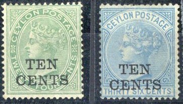 1885 CC, perf. 14 10c. on 24c. green and 10c. on 36c. blue, unused with part original gum and glazed gum respectively; the latter with a few short perfs. at top, otherwise sound. S.G. 162, 163, £950