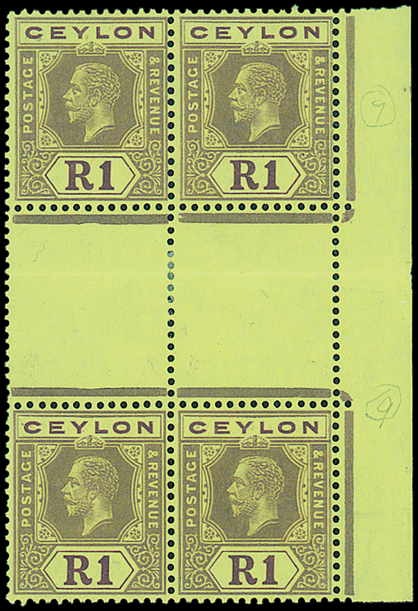 1921-32 Script 1r. purple on pale yellow Die I/II marginal block of four from the right of the sheet with interpanneau margin between, folded and hinged in margin, otherwise fine unmounted mint. S.G. 354b