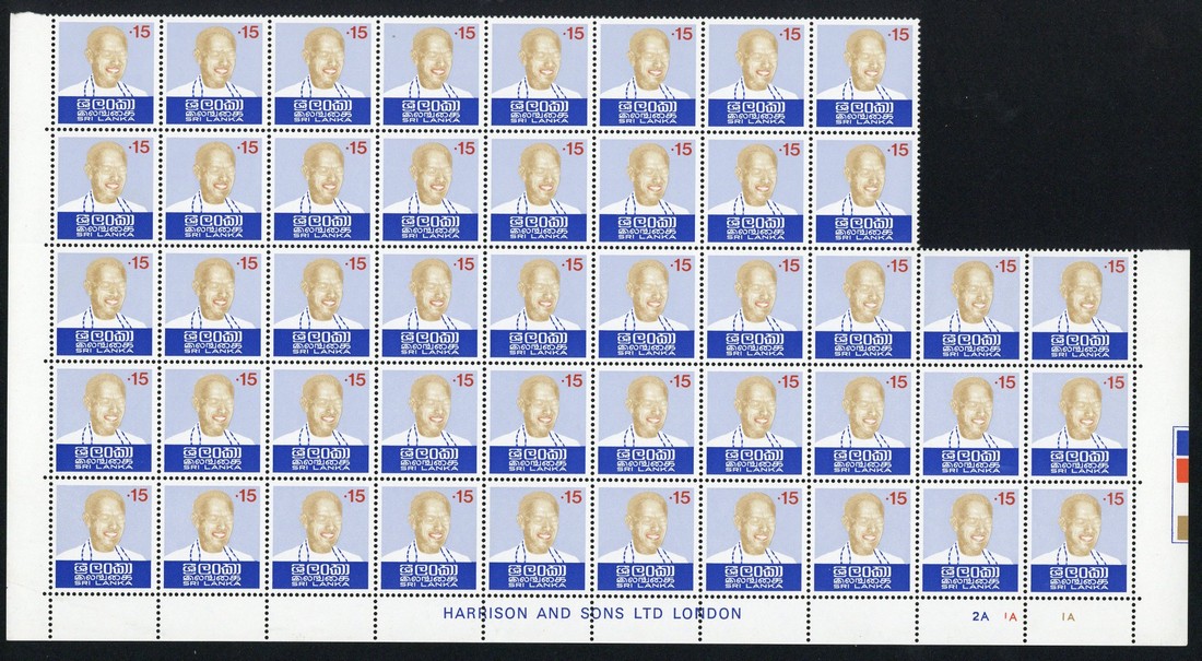 1974 (25 Sept.) Prime Minister Bandaranaike 15c. irregular block of forty-six, variety black (face shading) omitted, fine unmounted mint. S.G. 605var