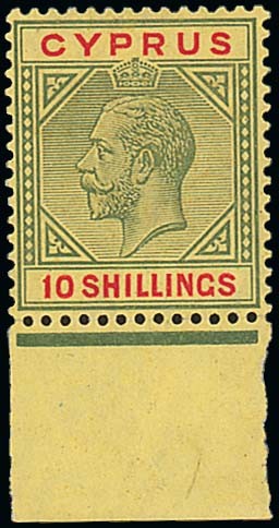 1921-23 MCA 10/- green and red on pale yellow, marginal from the foot of the sheet, imperceptibly hinged and very fine. S.G. 100, £400. Photo