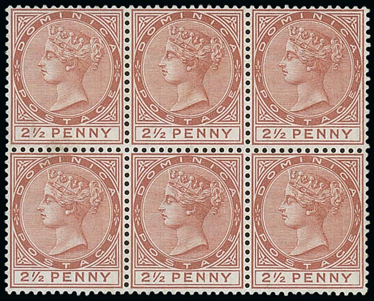1877-79 CC 2½d. red-brown block of six (3x2), lovely fresh colour and with large part original gum; faint traces of yellowing on gum. S.G. 6, £1,500. Photo
