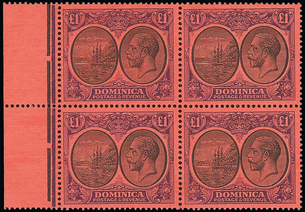 1923-33 £1 black and purple on red, left marginal block of four, fresh unmounted mint. S.G. 91, £900+. Photo