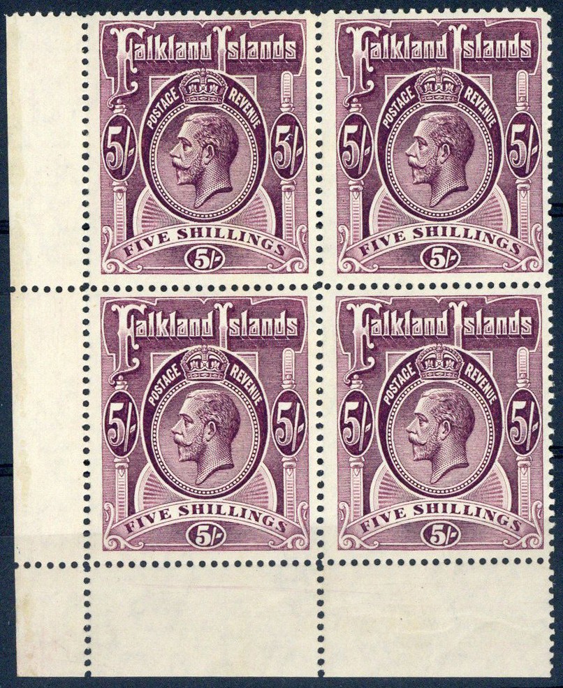 1912-20 5/- maroon block of four from the lower left corner of the sheet, fresh unmounted mint; the upper left stamp with slight wrinkle, otherwise very fine. S.G. 67b, £520+,