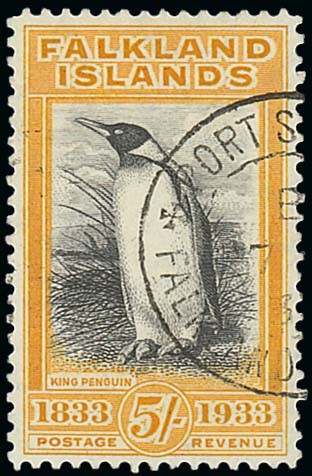 5/- black and yellow-orange, neatly cancelled by part Port Stanley double-ring datestamp; superb and scarce. B.P.A. Certificate (1970). S.G. 136a, £3,250. Photo