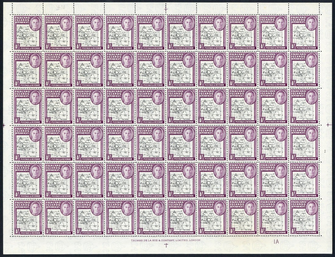 1946-49 Thick Map ½d. to 1/- set of eight in complete sheets of sixty (10x6), all with the "gap in 80th. parallel" [R1/4, 1/9, 3/4 and 5/9], the 3d. with "missing "I" in Is" [R1/2], 6d., 9d. and 1/- with "south poke" [R6/8], 3d. "extra island" [R3/9], "extra dot by oval" [R4/6] and "teardrop" flaw [R6/7] varieties, unmounted mint, fine. S.G. G1-G8
