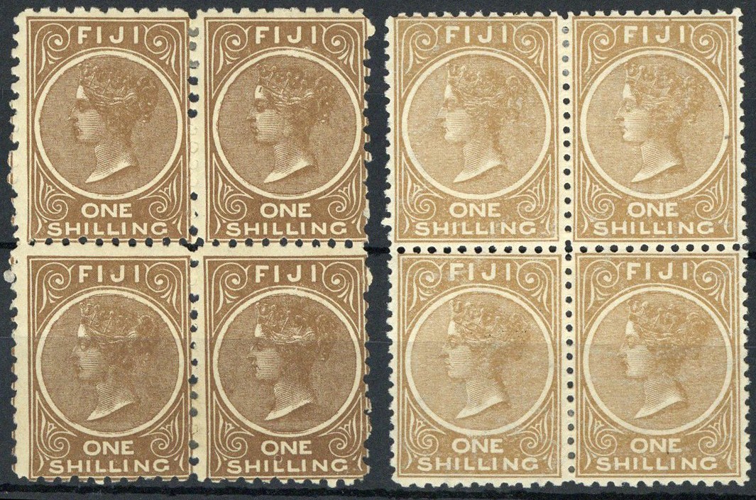 1881-99 perf. 10 1/- deep brown and perf. 11 x nearly 12 1/- pale brown blocks of four, part to large part original gum; the first with the lower pair creased. S.G. 64a, 67, £600+