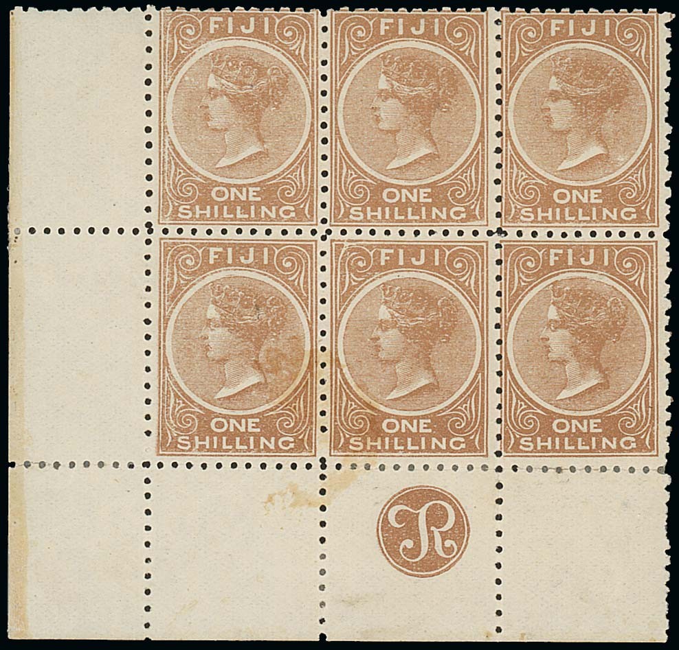 — perf. 11x10 1/- pale brown lower left corner block of six with "tr" (Thomas Richards) monogram, large part original gum with small residual patches of gum on the face. A very rare positional multiple. S.G. 65. Photo