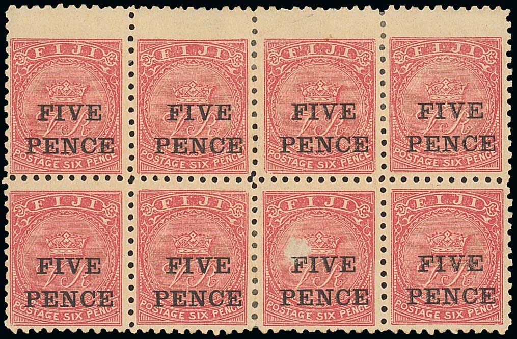1893 (Jan.) perf. 10 5d. on 6d. deep rose block of eight (4x2) from the top of the lower pane, part original gum and one with pre-surcharging surface fault; a few perforations reinforced. S.G. 75a, £560+. Photo