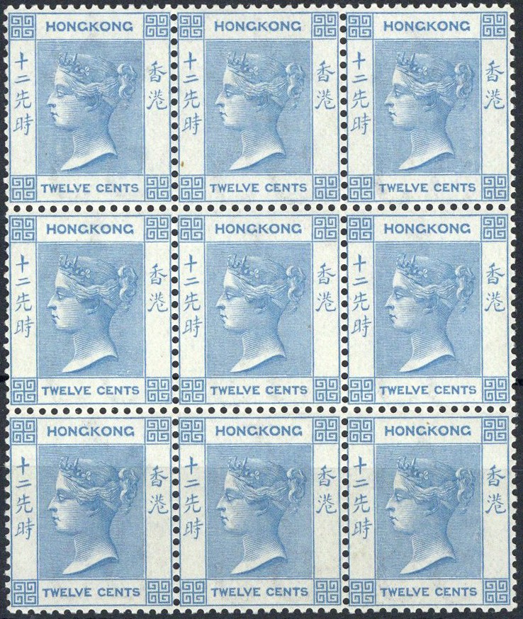 12c. pale blue block of nine, fresh with one stamp lightly mounted, the others unmounted; light fold at top of central horizontal row. S.G. 12a