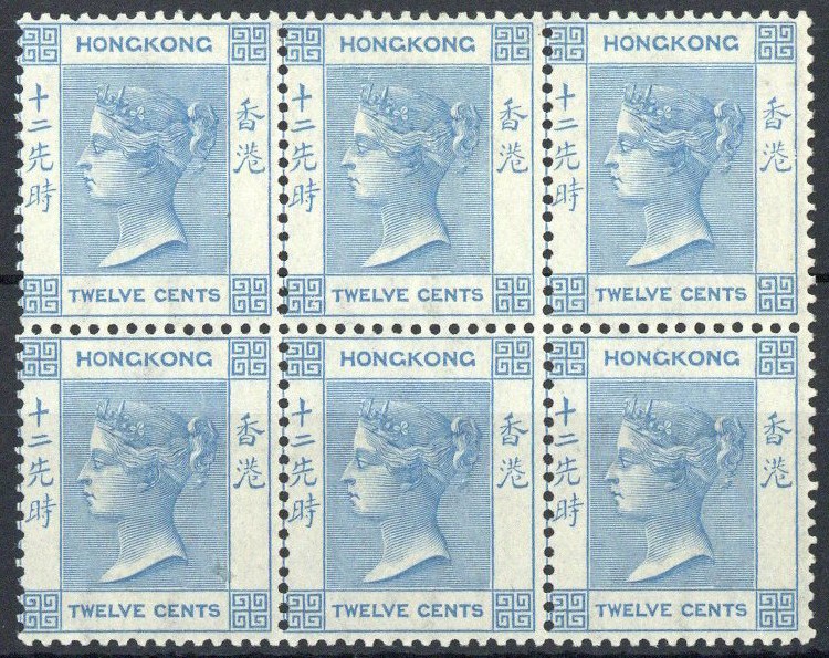 12c. pale blue block of six, fresh with large part original gum; one with small inclusion. S.G. 12a