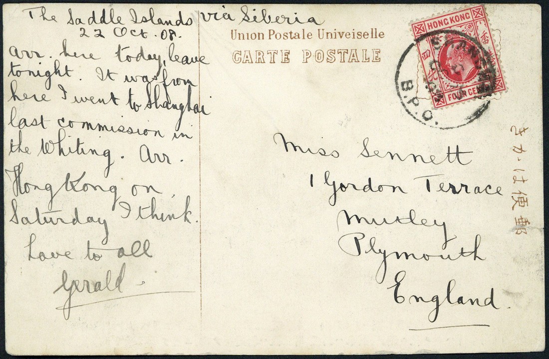 1908 (23 Oct.) Japanese picture post card sent from "The Saddle Islands" via Siberia to Plymouth, bearing Hong Kong K.E.VII 4c. tied by Shanghai B.P.O. c.d.s.; the card with small tear at side. Unusual