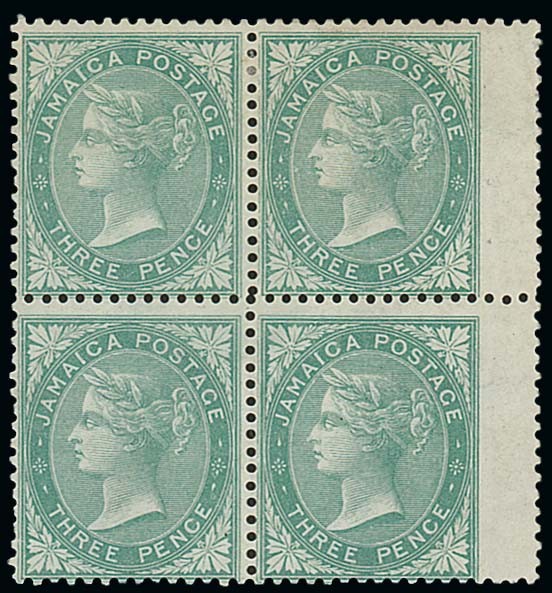 1863 watermark Pineapple, 3d. green wing-margin block of four, fresh mint with the lower pair remaining unmounted mint; very fine and most attractive. A scarce multiple. S.G. 3, £560+. Photo