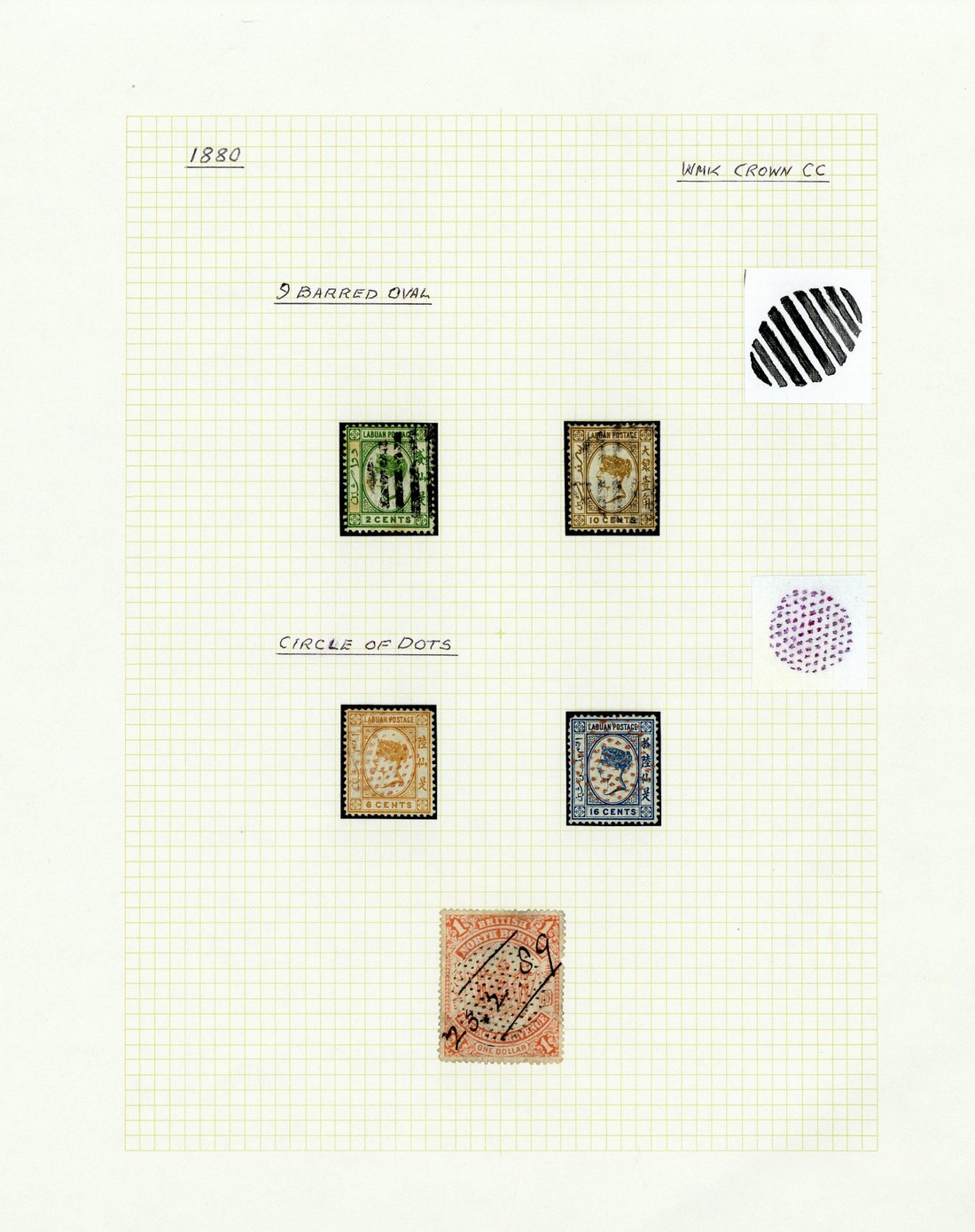 A selection on pages with oval of bars (6), circle of dots in red (4, two 1882 6c. and 16c.) and in black, a range of Straits Settlements (47) and other countries (35) used in Labuan, a few Paquebot, etc