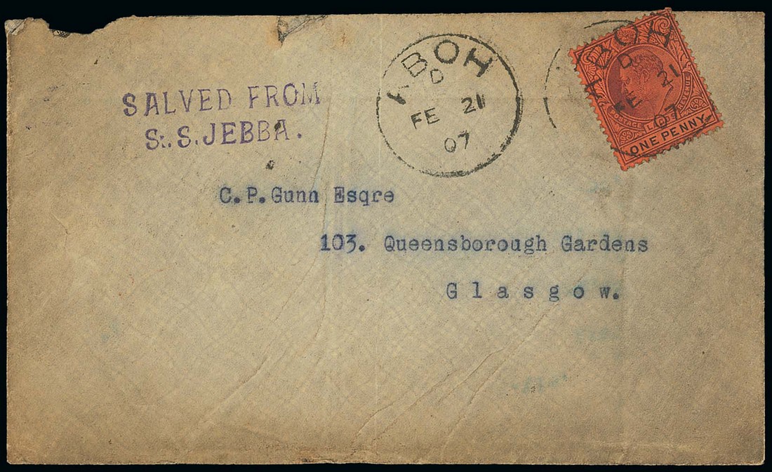 1907 (21 Feb.) envelope to Glasgow, bearing KE 1d. tied by "aboh" c.d.s. and showing "salved from/s.s. jebba" h.s. in violet; faults as to be expected. Photo