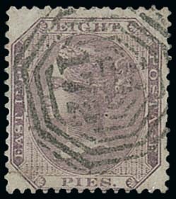 India 1860 8p. purple on bluish, with a central strike of "B/172", tear in lower left corner. Good appearance. R.P.S. Certificate (2013). S.G. Z79, £850. Photo