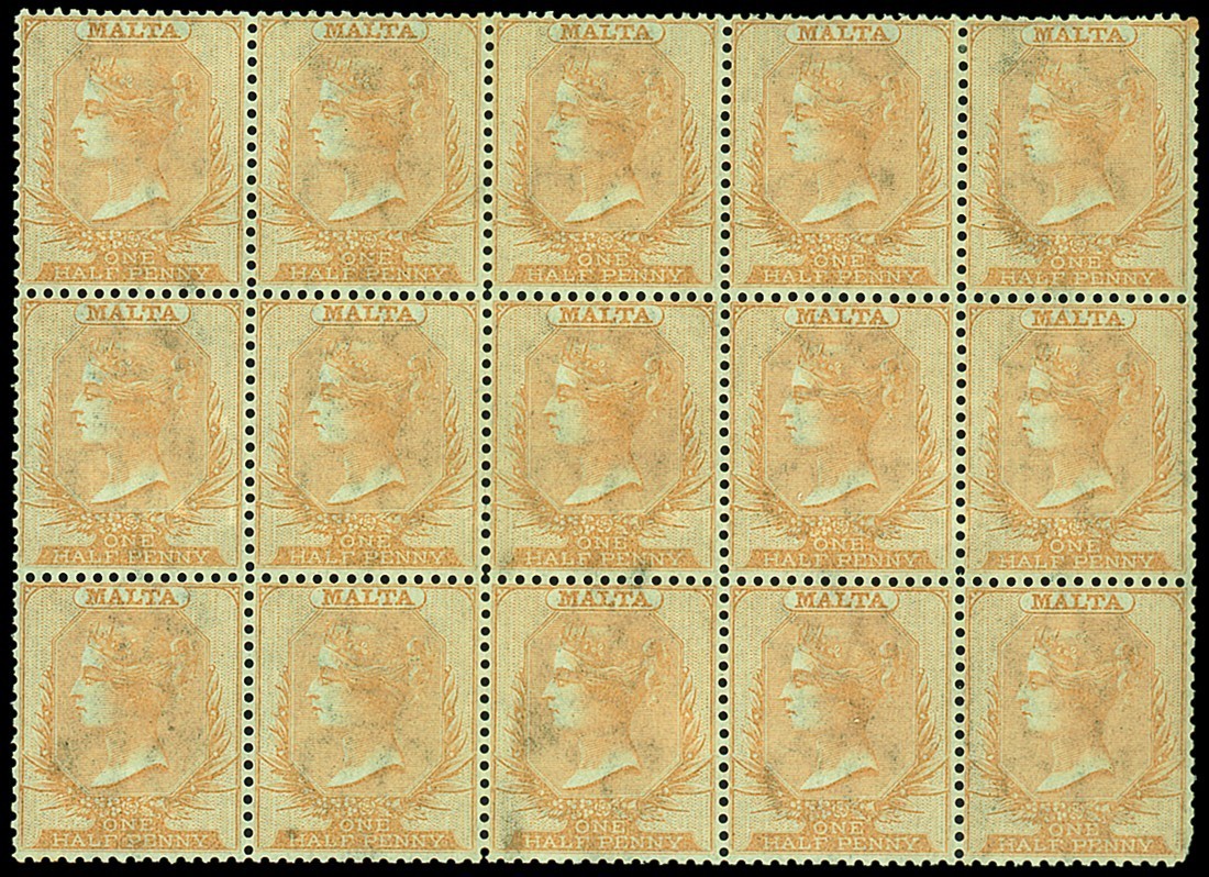 1860-84 CC, ½d. buff block of fifteen (5x3), unused with large part original gum, a few small imperfections, otherwise fine. S.G. 4, £1,800