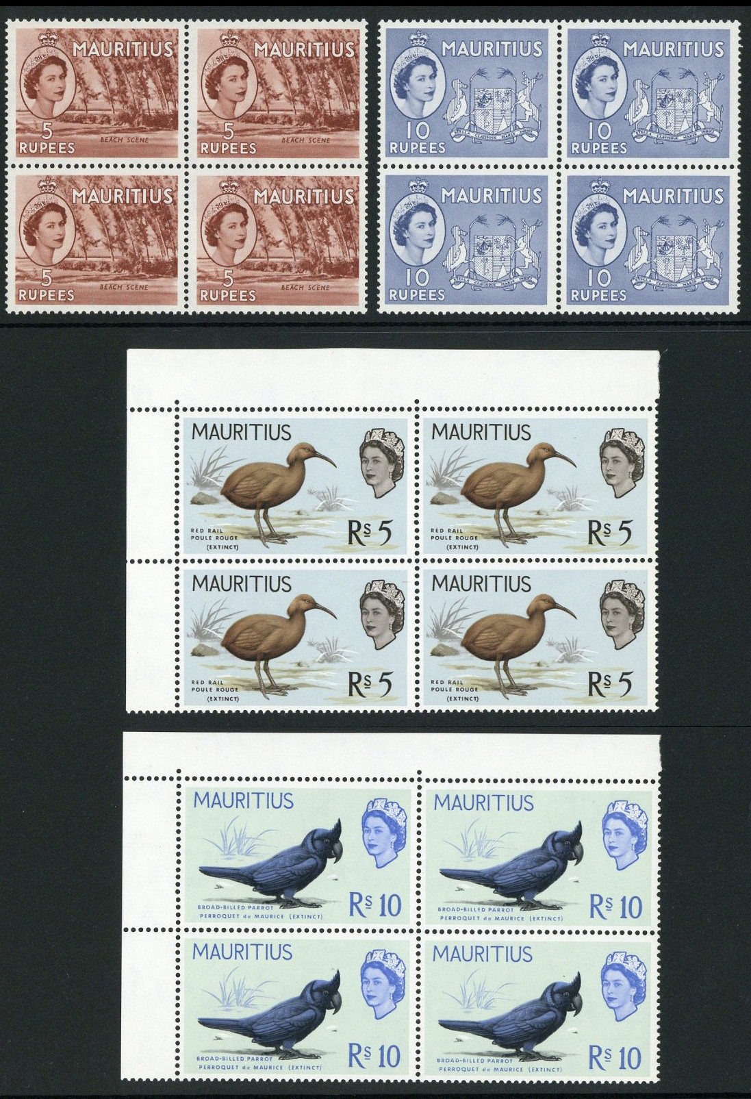 1953-58 Pictorial set of fifteen with additional shades on 10c. (2), 60c., 1r., all in blocks of four, and 1965 Birds set of fifteen in corner marginal blocks of four; fine unmounted mint. S.G. 293-306, 317-331, £568