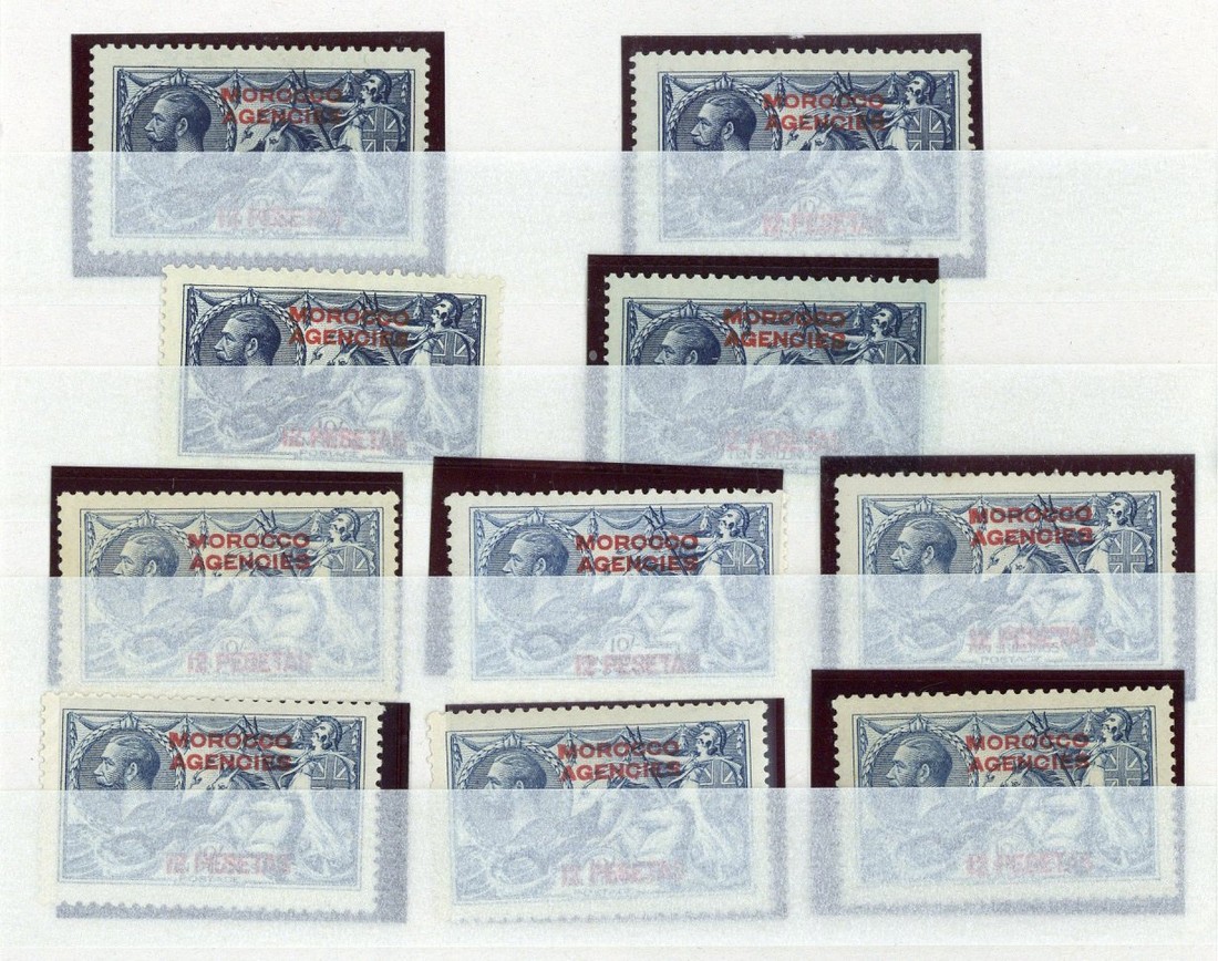 1914-37 mint and used selection of Great Britain "Seahorse" overprinted issues arranged in stockbook, including British Currency 1914-31 2/6d. (15, seven mint with a block of four), 1935-37 Re-engraved 2/6d. (5, two mint), 5/- (6 mint), French Currency 1924-32 6f. on 5/- (4, two mint and one overprinted "specimen") and Spanish Currency mint 1914-26 3p. on 2/6d. (9), 6p. on 5/- (6), 12p. on 10/- (10); also British Levant Turkish Currency 1921 45pi. on 2/6d. (6, four mint), 90pi. on 5/- (19, ten mint), 180pi. on 10/- (12, four mint) and British Currency 2/6d. (2, one mint). Condition mixed. (138). Cat. £4,236+