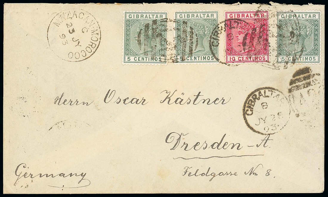 1893 (23 July) envelope from Mazagan to Germany, bearing 1889-96 5c. green (3) and 10c. carmine twice cancelled by "A26" vertical obliterator and with Mogador c.d.s. alongside, the stamps further cancelled with Gibraltar "A26" duplex in transit (28.7), the reverse with Madrid (31.7) and Dresden (3.8) c.d.s.; fine. B.P.A. Certificate (2012). Photo