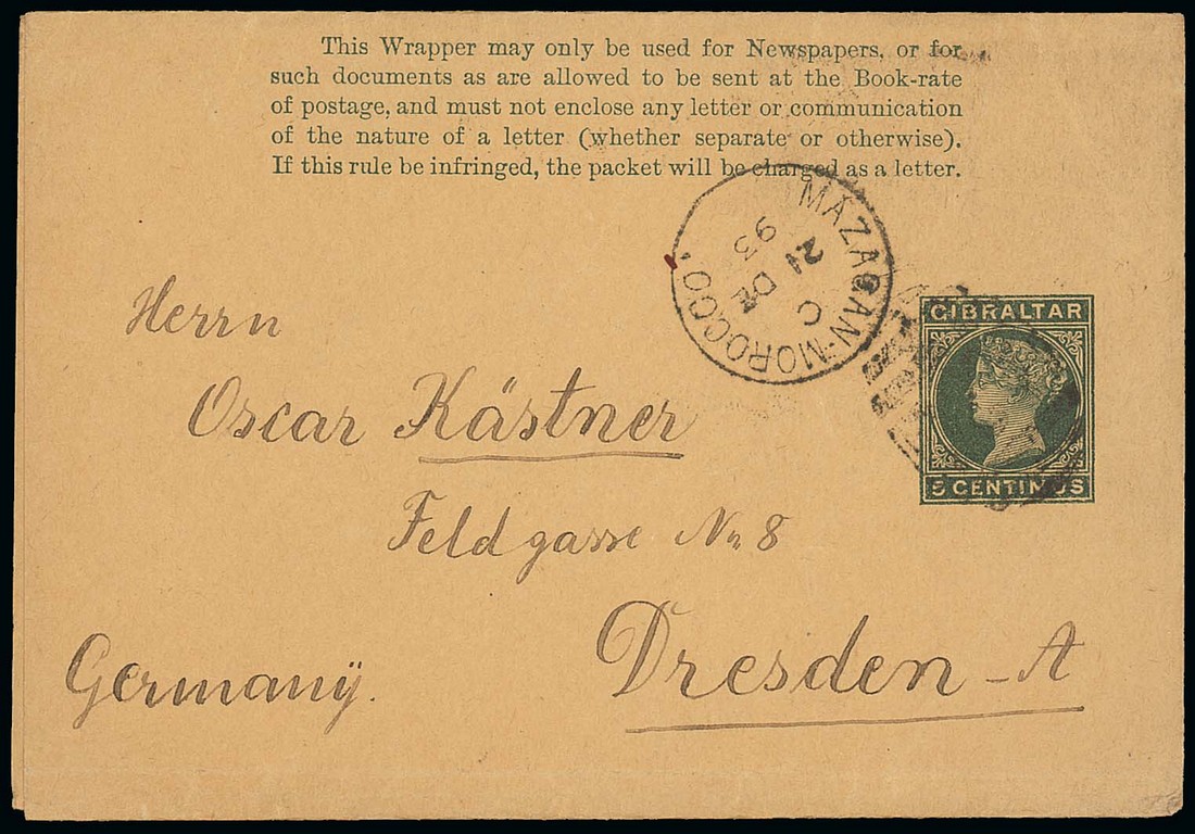 1893 (21 Dec.) 5c. deep green wrapper from Mazagan, cancelled "A26" and with despatch c.d.s. alongside, Gibraltar transit c.d.s. (28.12) on reverse. A rare use of this unoverprinted stationery used in Mazagan. B.P.A. Certificate (2012). Photo