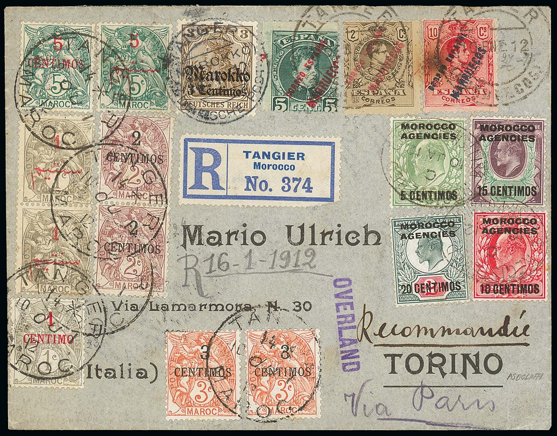 1912 (10 Jan.) envelope registered to Turin, bearing Spanish Currency 5c. on ½d., 10c. on 1d., 15c. on 1½d., 20c. on 2d., French Post Office 1c. on 1c. (2), 2c. on 2c. (2), 3c. on 3c. (2), 5c. on 5c. (2), German Post Office 3c. on 3pf. and Spanish Post Office 2c., 5c. and 10c. (damaged), all tied by the appropriate cancellations; fine. Photo