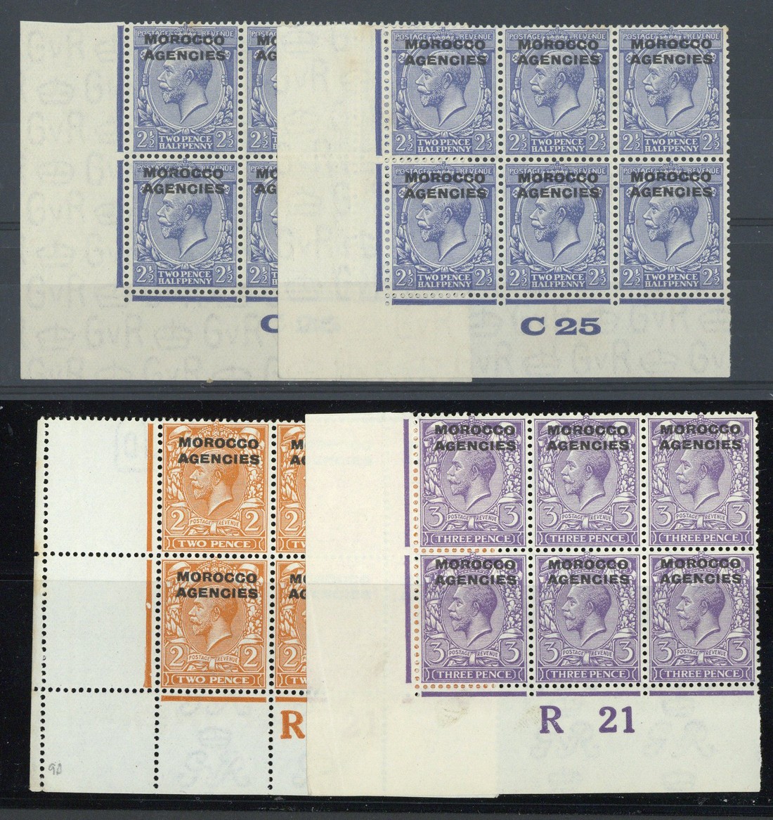 1914-31 2d "R21", 3d. "R21", 1925-36 ½d. "D25", 2d. "B24" and "D25", and 2½d. Type 7 "C25" (two shades), mint control blocks of six; the odd tone mark in places, otherwise fine