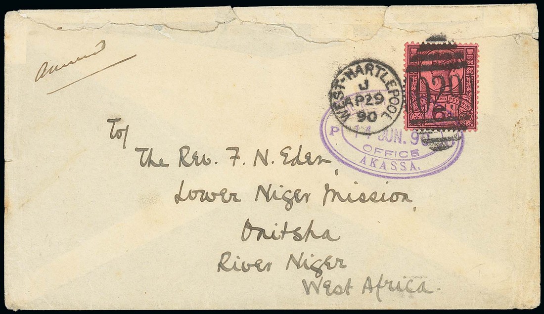 1890 (29 Apr.) envelope (faults) from England to Rev. Eden of the Church Missionary Society at Onitsha River Niger, bearing 1887-92 6d. purple on rose-red neatly cancelled by West Hartlepool "029" duplex and a fine strike of the oval d.s. for 14 June. Photo