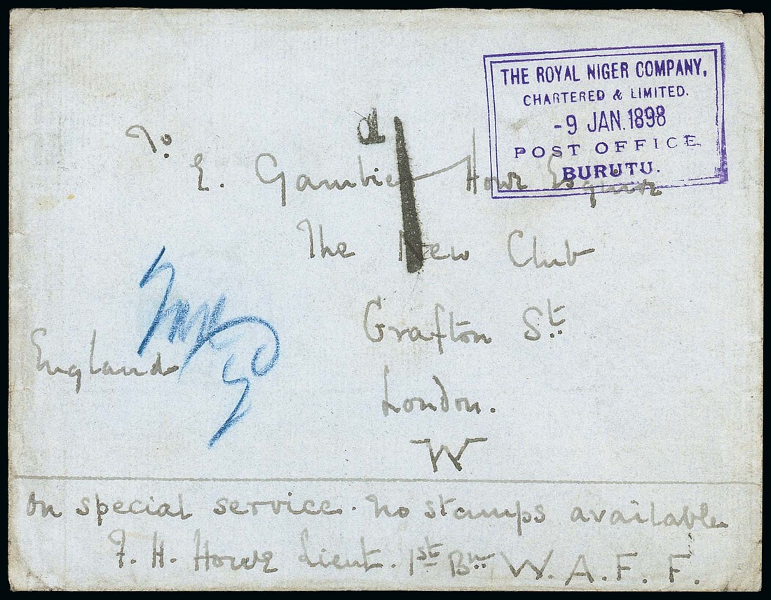1898 (9 Jan.) unstamped envelope (light fold) to England, marked "On special service no stamps available/F. H. Howe Lieut. 1st Bn W.A.F.F.", showing fine strike in violet and "d1" tax h.s., "T2" in blue crayon alongside, the reverse with Liverpool Br. Packet (2.2) transit and London (3.2) arrival c.d.s. Photo