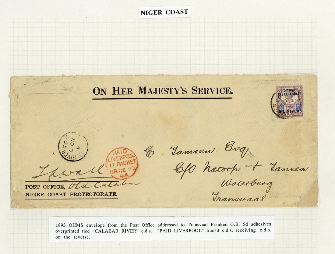 1893 (7 Nov.) OHMS envelope to Transvaal, bearing 1892-94 5d. tied by Old Calabar River c.d.s.; also 1894 (28 Jan.) similar envelope (somewhat distressed) to Liverpool (?) bearing 1d., 2½d. pair and 1/- (faded)