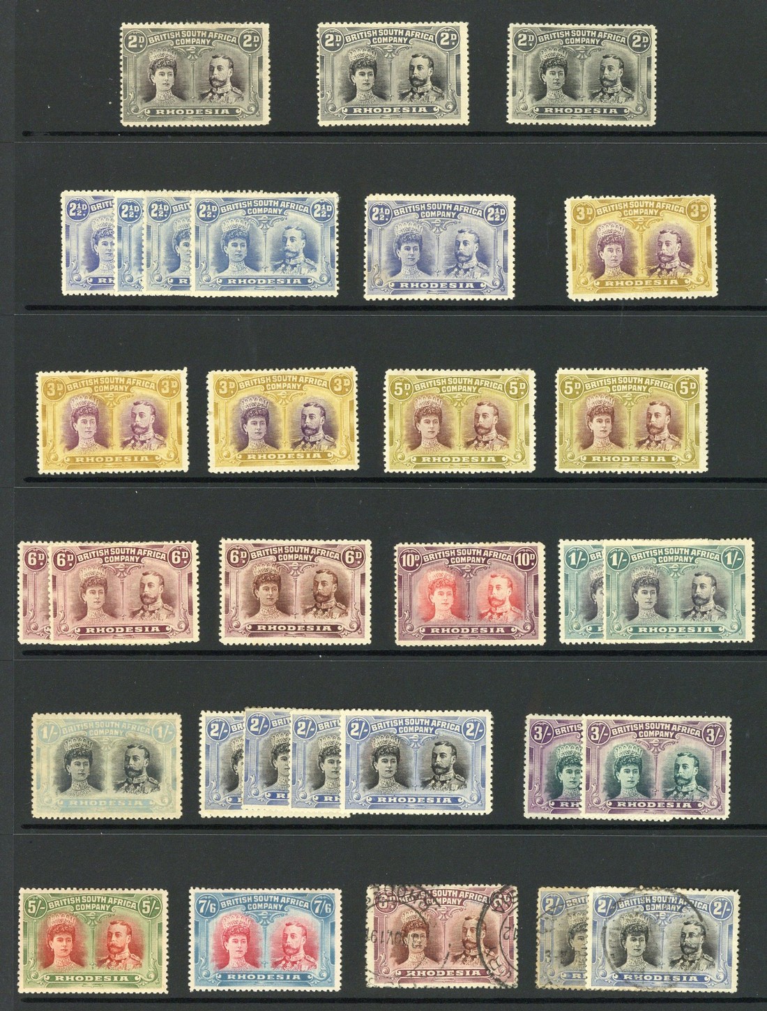 A mint selection comprising 2d. (3, one black-purple and slate-grey), 2½d. (5, one perf. 13½), 3d. (3, one violet and ochre), 5d. (2), 6d. (3), 10d., 1/- (3, one Gash in Queen's ear), 2/- (4, one Gash in Queen's ear), 3/- RSC "A" (2), 5/- vermilion and deep green and 7/6d. carmine and pale blue, and 6d. and 2/- (2) used; a small number to 7/6d. with imperfections though of generally fine appearance