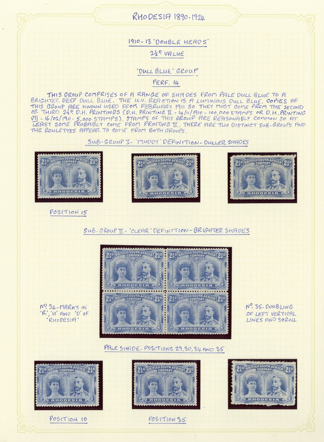 2½d. collection in a range of shades and comprising a pair and a single (all without gum) overprinted "specimen", mint (40) with blocks of nine and four (3) perf. 15 and perf. 13½ (5), clandestine roulettes (2) and used (22) with a block of six cancelled-to-order at Gwelo and a couple perf. 15 and 13½; a few faults though generally of fine appearance