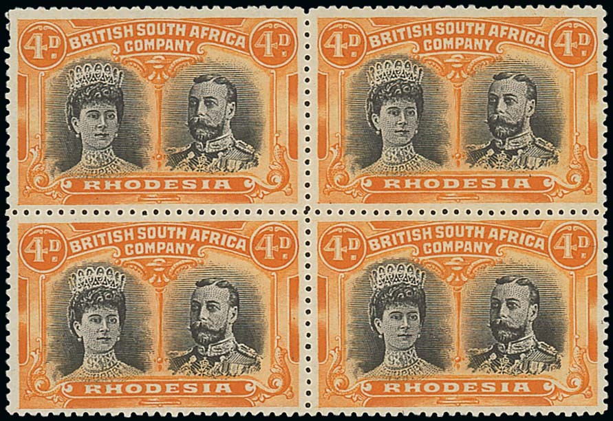 4d. black and orange RSC "B" block of four, [13-19], [13] with printer's mark, fresh unmounted mint. Photo