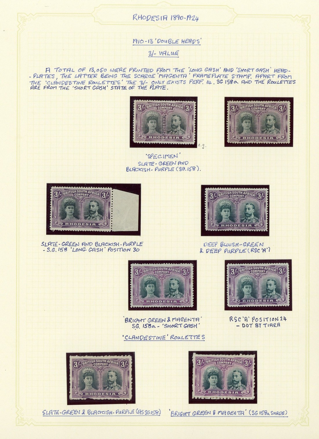 3/- selection, one overprinted "specimen" (no gum), S.G. 158 (2, one marginal) and RSC "A" (2, one [24]) mint, S.G. 158a bright green and magenta with 50% gum, two clandestine roulettes in contrasting shades, and two used; fair to fine