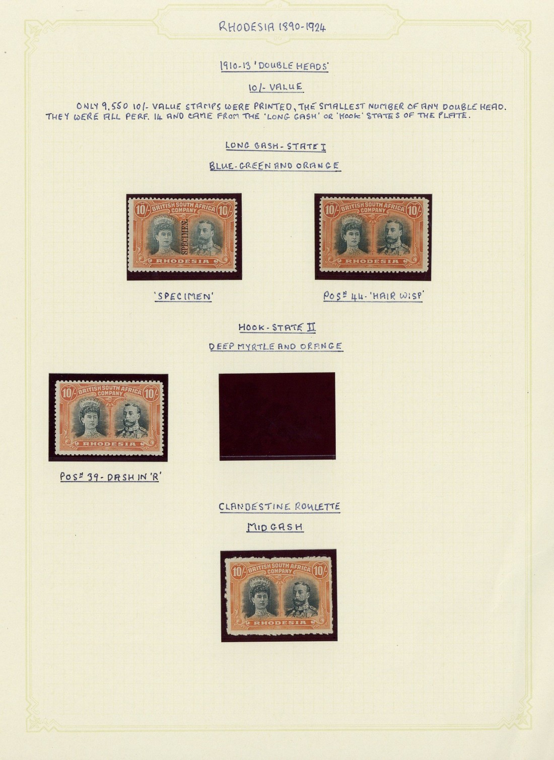 10/- deep myrtle and orange [39] and blue-green and orange (2), one overprinted "specimen" and one [44] (one short perf. at right), mint, and a clandestine roulette