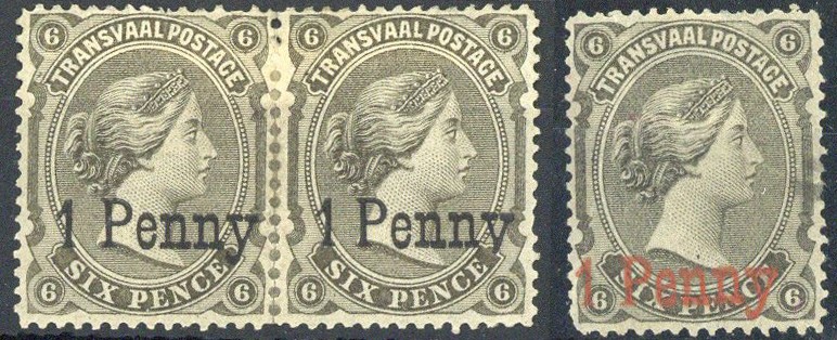 1879 "1 Penny" (Type 10) on 6d. rejoined horizontal pair and a single surcharged in red, part original gum; a few small faults as usual though good for this issue. S.G. 140, 140a, £525